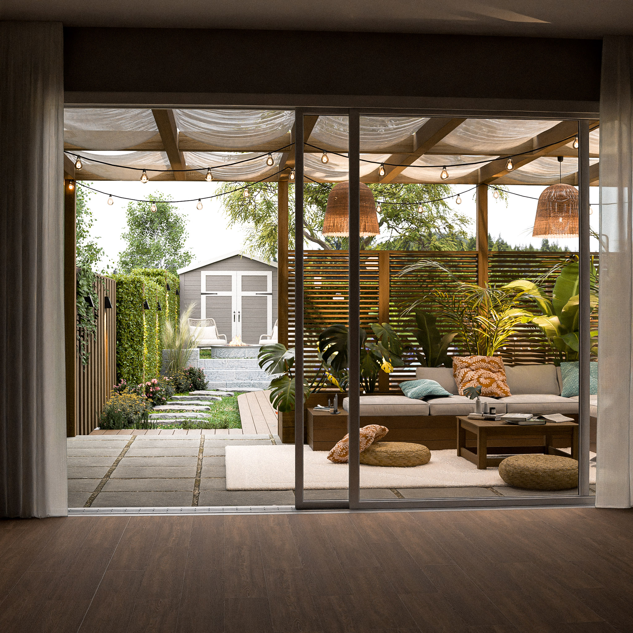 Mit geöffneten Lamellen entsteht jetzt eine perfekte Linie vom Sofa im Wohnzimmer → über die Terrasse → zum Pool. Dieser Blick macht den Garten größer, tiefer und lebendiger.