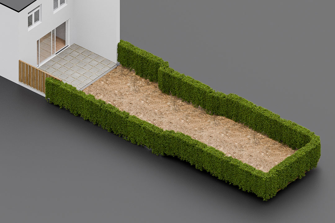 Ein rechteckiger Schlauch, eingefasst von hohen Hecken, ohne Struktur, ohne Charme und ohne jede Vorstellung, wie daraus jemals ein Ort zum Leben werden sollte.