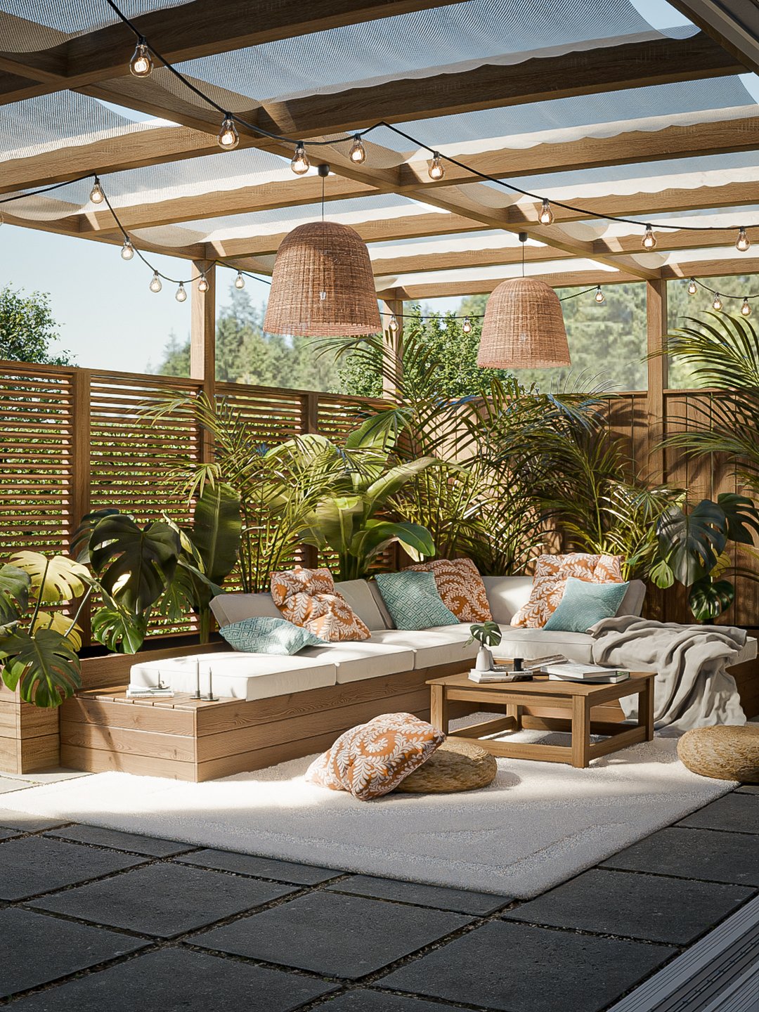 Die zuvor leere, graue Fläche wurde zur warmen, überdachten Lounge: